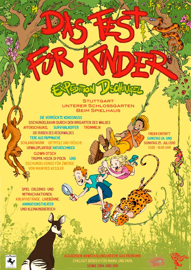 Spannende Abenteuer und viel Spaß verspricht „Das Fest für Kinder“, das bereits zum 13. Mal von der Stuttgarter Jugendhaus Gesellschaft und dem Jugendamt Stuttgart organisiert wird. Am 24. und 25. Juli verwandelt sich das Gelände rings um das Spielhaus im unteren Schlossgarten in einen riesigen Dschungel. Jeweils von 13 bis 18 Uhr sind alle Kinder eingeladen eine Expedition in den Dschungel zu unternehmen. Am Samstag endet der Tag mit dem Künstler Manfred Kessler und seinen „Dschungelsongs für Zwerge“. Auch die Gastronomie bleibt an diesem Tag bis 20 Uhr geöffnet.