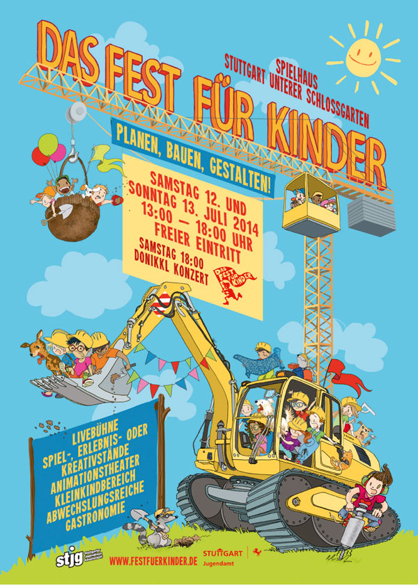 Unter dem Motto “Planen, Bauen, Gestalten!” präsentieren die Stuttgarter Jugendhaus Gesellschaft (stjg) und das Jugendamt zum 17. Mal “Das Fest für Kinder”. Am 12. und 13. Juli verwandelt sich das Gelände rings um das Spielhaus im Unteren Schlossgarten in eine große, kreative Baustelle. Zwei Tage lang können Familien bei freiem Eintritt zwischen 13 und 18 Uhr mit ihren Kindern nach Herzenslust buddeln, baggern und bauen.